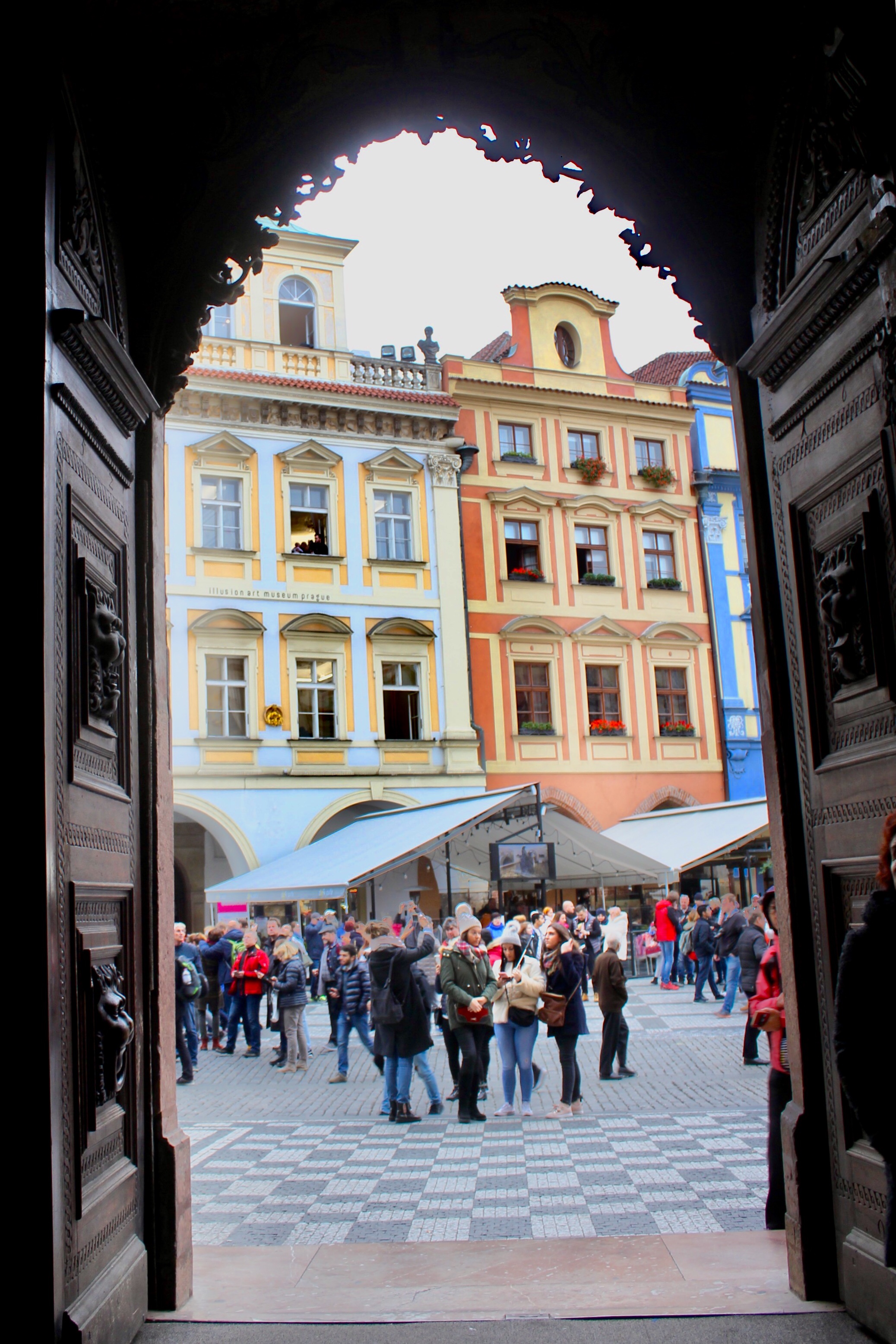 This shot was taken from the building of the Astronomical clock looking out into the Old Town Hall Square. All these people are waiting for the clock to strike, which does every hour, on the hour.