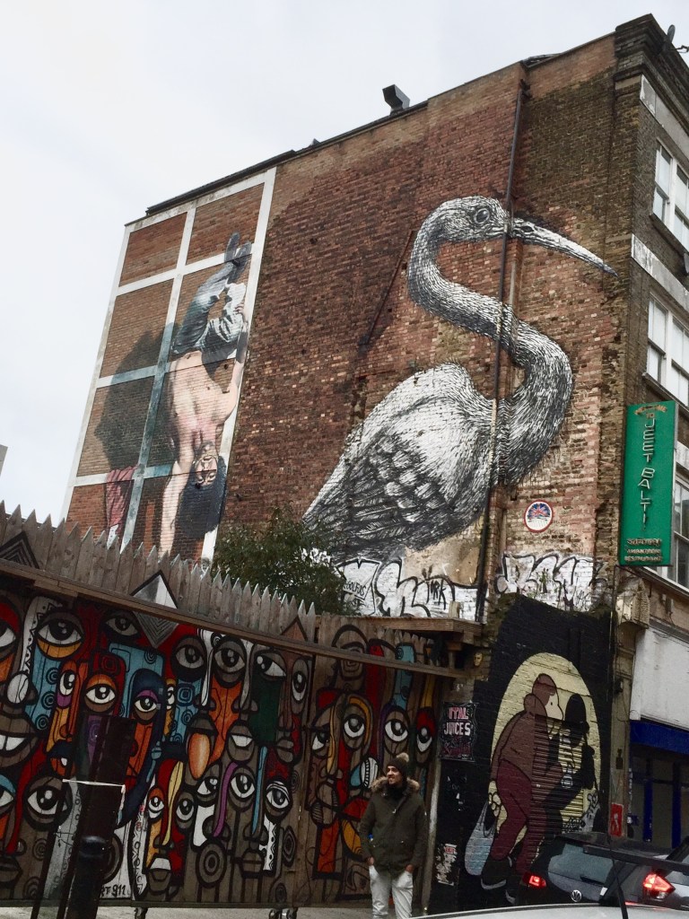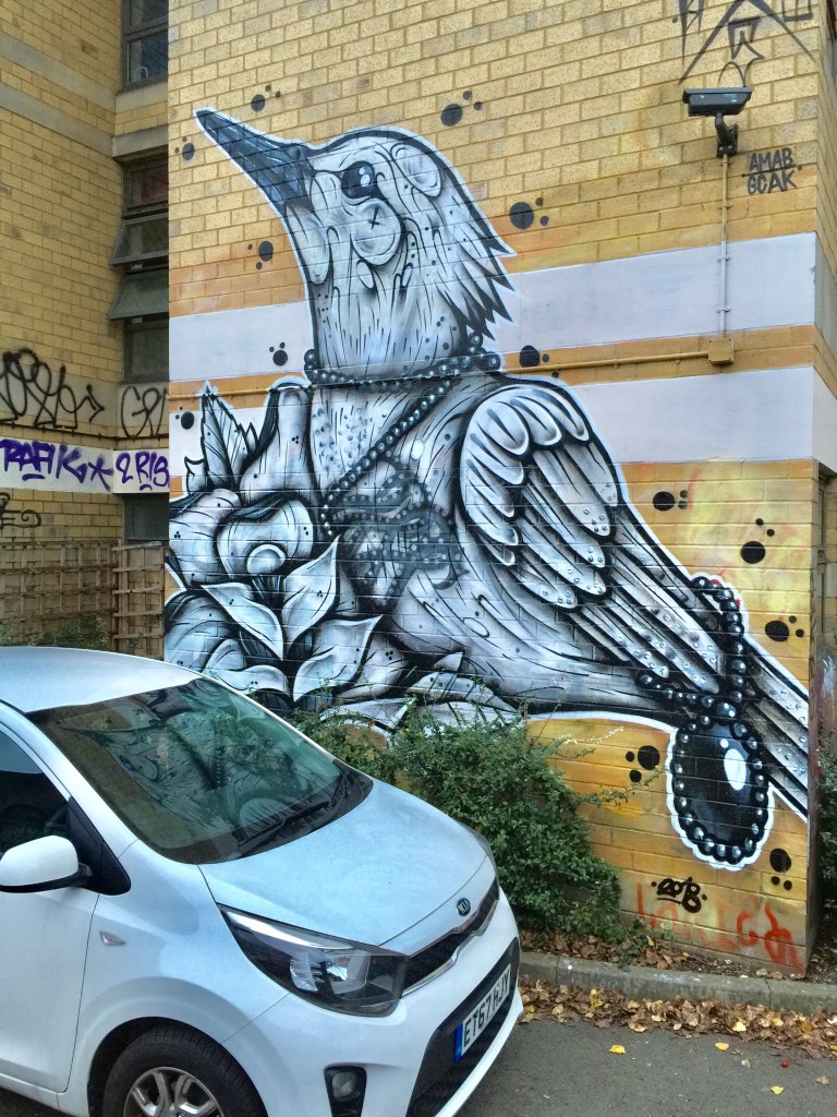 Roa’s tall bird in the junction of Hanbury and Brick Lane.
