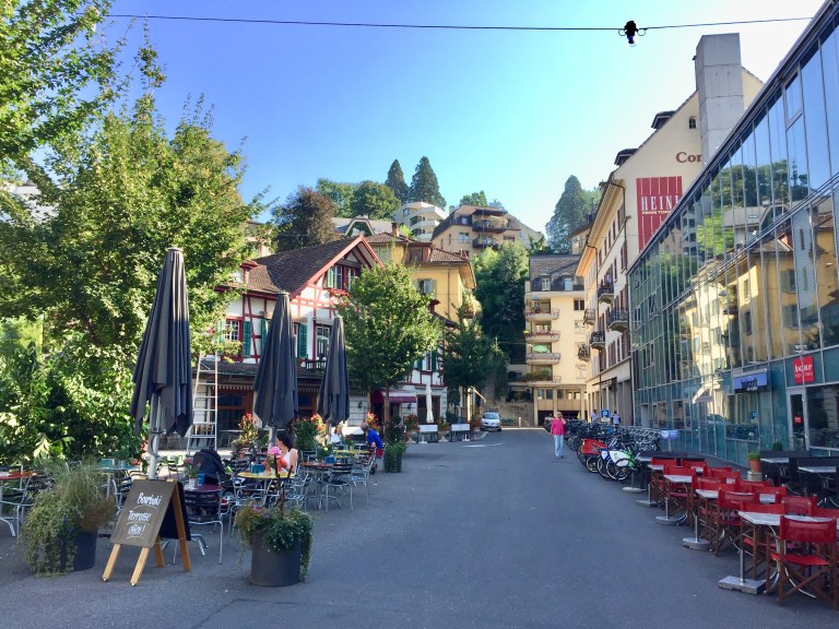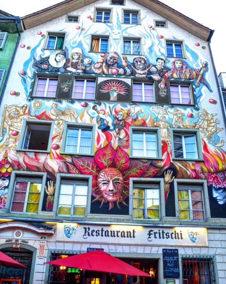 The Beautiful building architecture and structures of Lucerne. Church, shops, restaurants and streetart.
