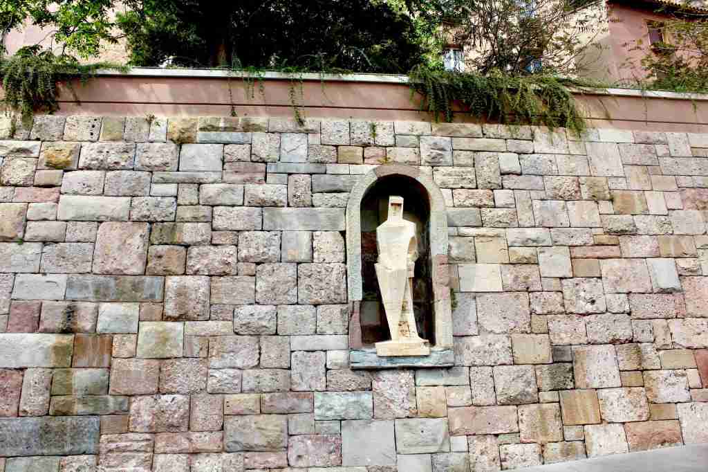 Sculpture of Saint George by Pablo Picasso in a stone wall just outside the Abbey.