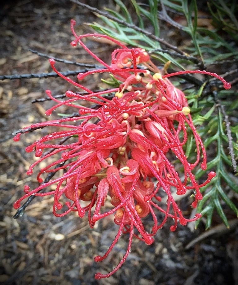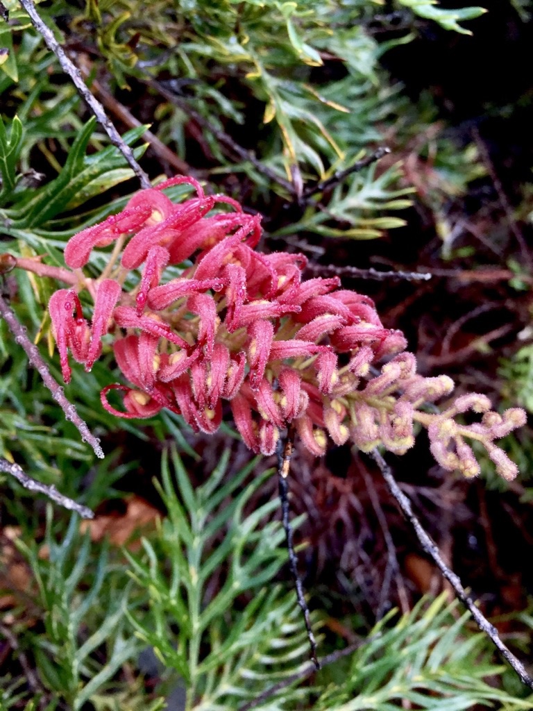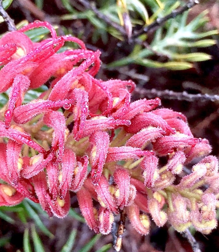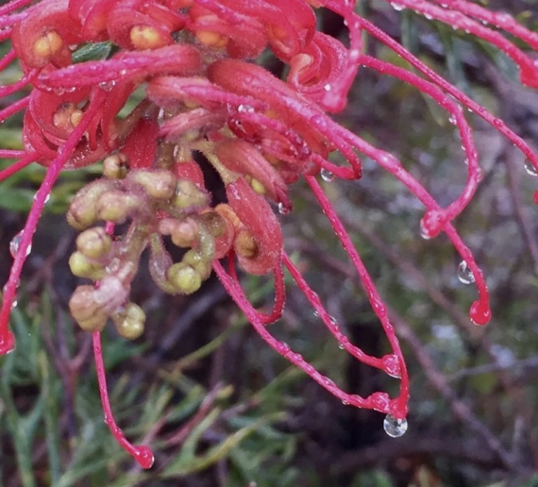 That’s a grevillea bush. We have several in our front yard in Southern California. They are so unique and beautiful! I love the rain drops on the ones in your lovely pictures.