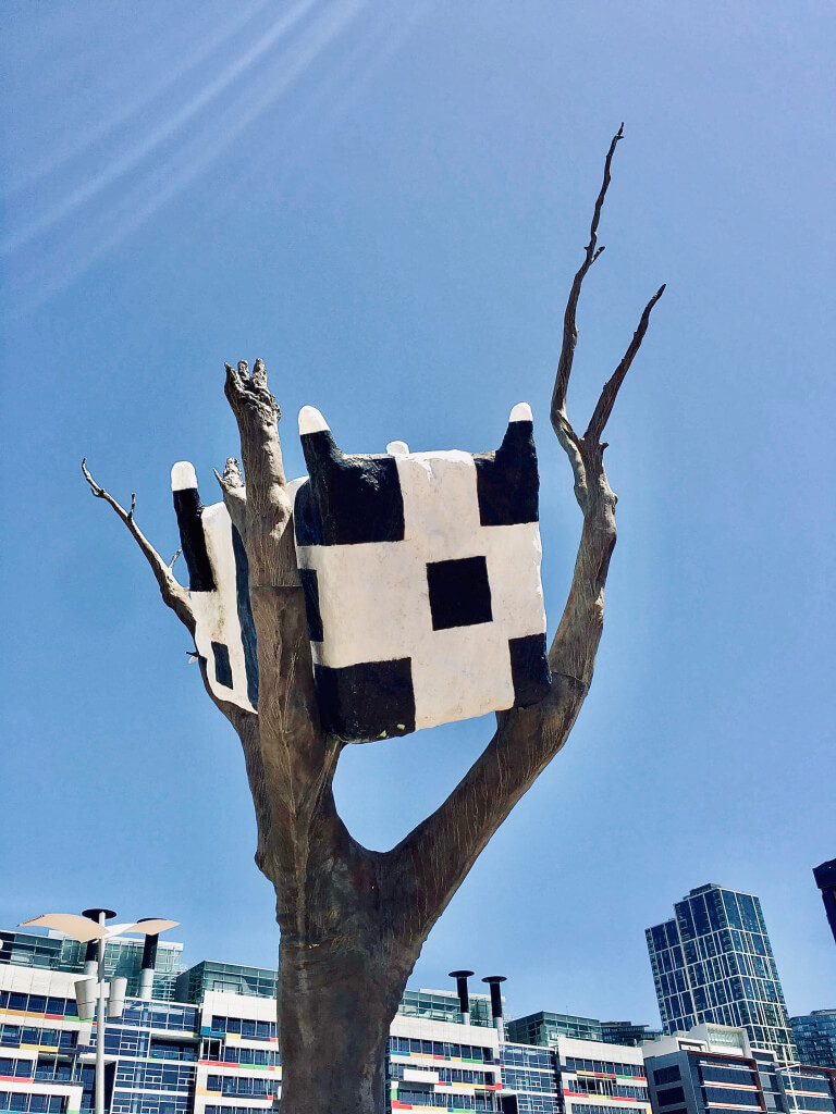 This is the iconic “Cow up a Tree” artwork on Harbour Esplanade in Melbourne.
