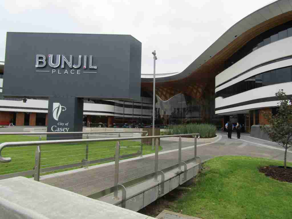 This is Bunjil Place, an entertainment precinct in Melbourne’s south east. What makes it unique is its striking architecture. Its rooftop is resembling a soaring eagle’s wings and the timber grid that goes into the foyer is its legs.