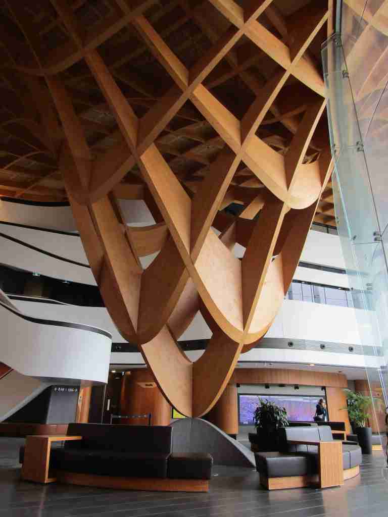 This is Bunjil Place, an entertainment precinct in Melbourne’s south east. What makes it unique is its striking architecture. Its rooftop is resembling a soaring eagle’s wings and the timber grid that goes into the foyer is its legs.
